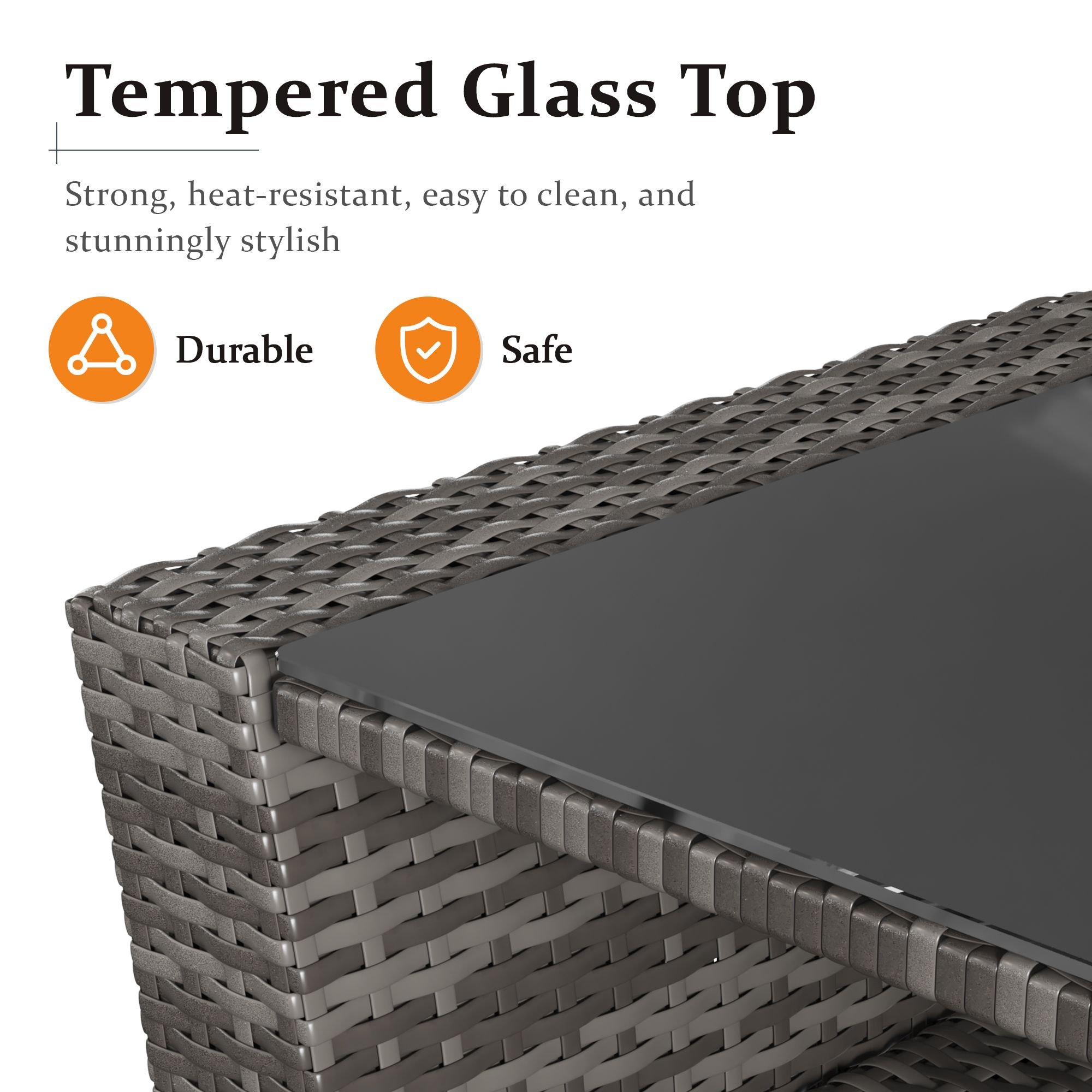 Easy Cleaning: The cushion covers are equipped with a zipper for quick removal. Both steel frame and PE rattan wicker are splash-proof, ensuring easy maintenance. Keep the tempered glass tabletop looking fresh by wiping it down with a wet towel.