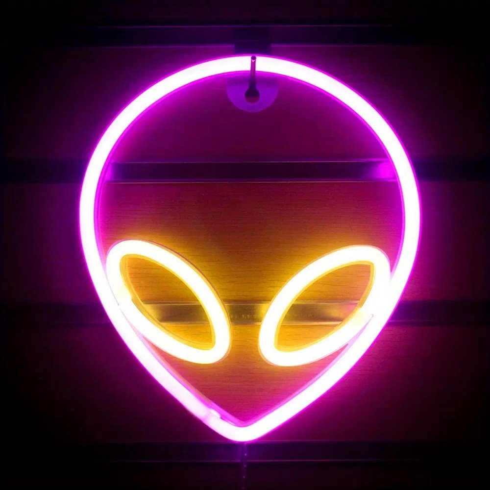 "A haunting silhouette of extraterrestrial light. The iconic almond-shaped eyes are left as voids of darkness, framed by a vibrant Pink halo that seems to vibrate against the wall. It’s a piece of cosmic art that feels like a signal sent from a distant galaxy, casting an otherworldly glow over everything it touches.""Straight from a 1950s desert diner, this neon traveler pulses with a playful energy. The sleek, minimalist lines of the 'Grey' are rendered in buzzing glass tubes, flickering slightly as if communicating in code. It’s a kitschy, electric tribute to the unknown, turning any room into a high-voltage X-File."